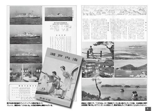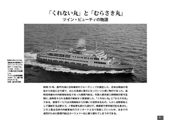 昭和35年、瀬戸内海に日本最初のクルーズシップが誕生した。日本は戦後の混乱から完全に立ち直り、みんな急速に豊かになっていった良い時代であった。当時日本最大の内航客船会社であった関西汽船は、外国人観光客と新婚旅行客を主眼に、当時考えられる最高の客船を2隻建造した。「くれない丸」と「むらさき丸」である。接客サービスは大阪商船から引き継いだ定評のあるもの。しかし定期客船として運航する必要から。3等船室も設けた設計で、帰郷客や修学旅行生も乗せた。この2隻は日本の内航客船のスタンダードとなり発展していったが、あまりの成功のために関西汽船はカーフェリー化に乗り遅れてしまうのである。 「くれない丸」の建造から「ロイヤルウイング」になるまでの変遷を写真とイラスト、解説でご紹介いたします。